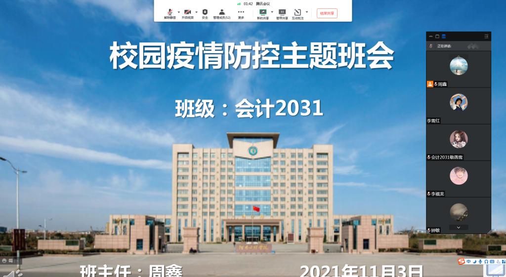 为积极贯彻落实学校疫情防控安排,进一步做好校内疫情防控工作,加强对学生的思想引导、心理疏导和学习生活指导,会计学院于11月7日陆续组织开展线上疫情防控主题班会,会议由各年级辅导员和各班班主任主讲。