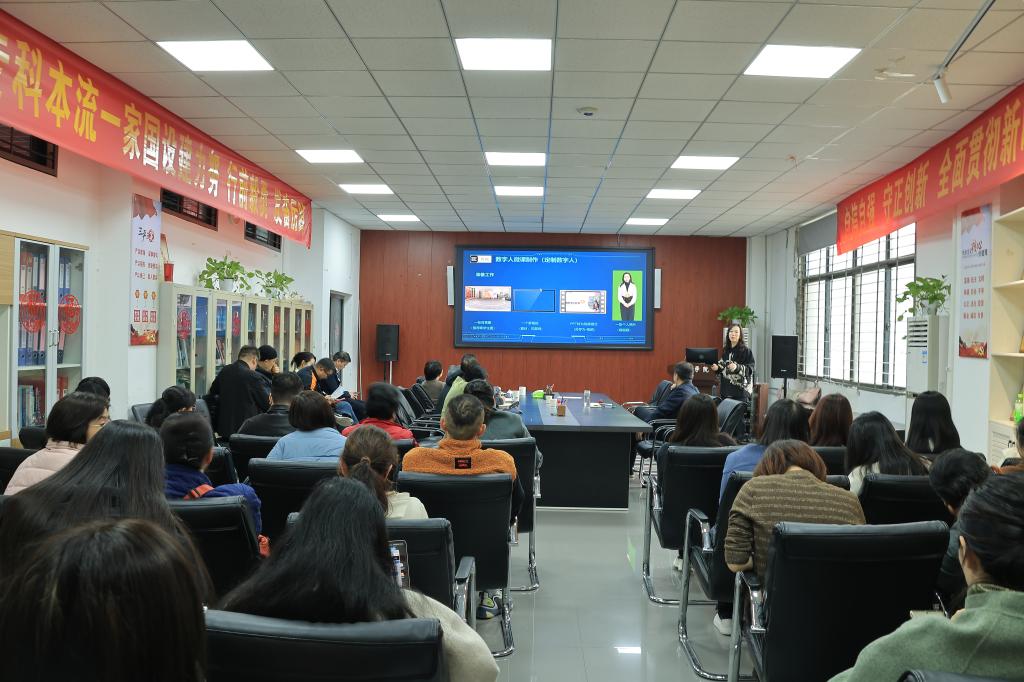 刘根霞对崔静老师的到来表示衷心感谢,并指出本次讲座内容前沿、实用性强,不仅是学习一项新技术,更是一次推动教学理念革新的契机。崔静首先讲解了数字人技术在创设生动教学情境、显著提升课程吸引力等多个方面所展现出重要的价值。随后,她着重介绍了几款当前市场上主流数字人制作软件,并对其各自的功能特点和应用场景进行了详尽而细致的分析。最后通过实际操作,展示了从文本脚本的撰写、数字人形象与声音选择,到最终视频生成与合成的完整流程,为大家提供了一个清晰的全流程实例演示。互动环节中,与会教师们与崔静就软件工具的合理选择、具体应用场景的设计以及数字人生成的关键技术等内容进行了沟通与交流。教师们表示本次培训内容丰富、实用性强,对于他们在未来教学中更好地应用数字人技术,提升教学效果具有重要的意义。