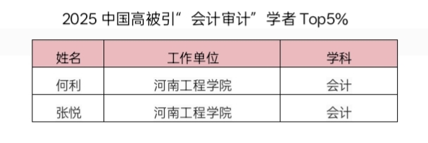 本次评选中,我院何利、张悦两位教师成功入选“2025中国高被引‘会计审计’学者Top5%”榜单,这一成果充分彰显了学院在学术界的影响力与学科竞争力。